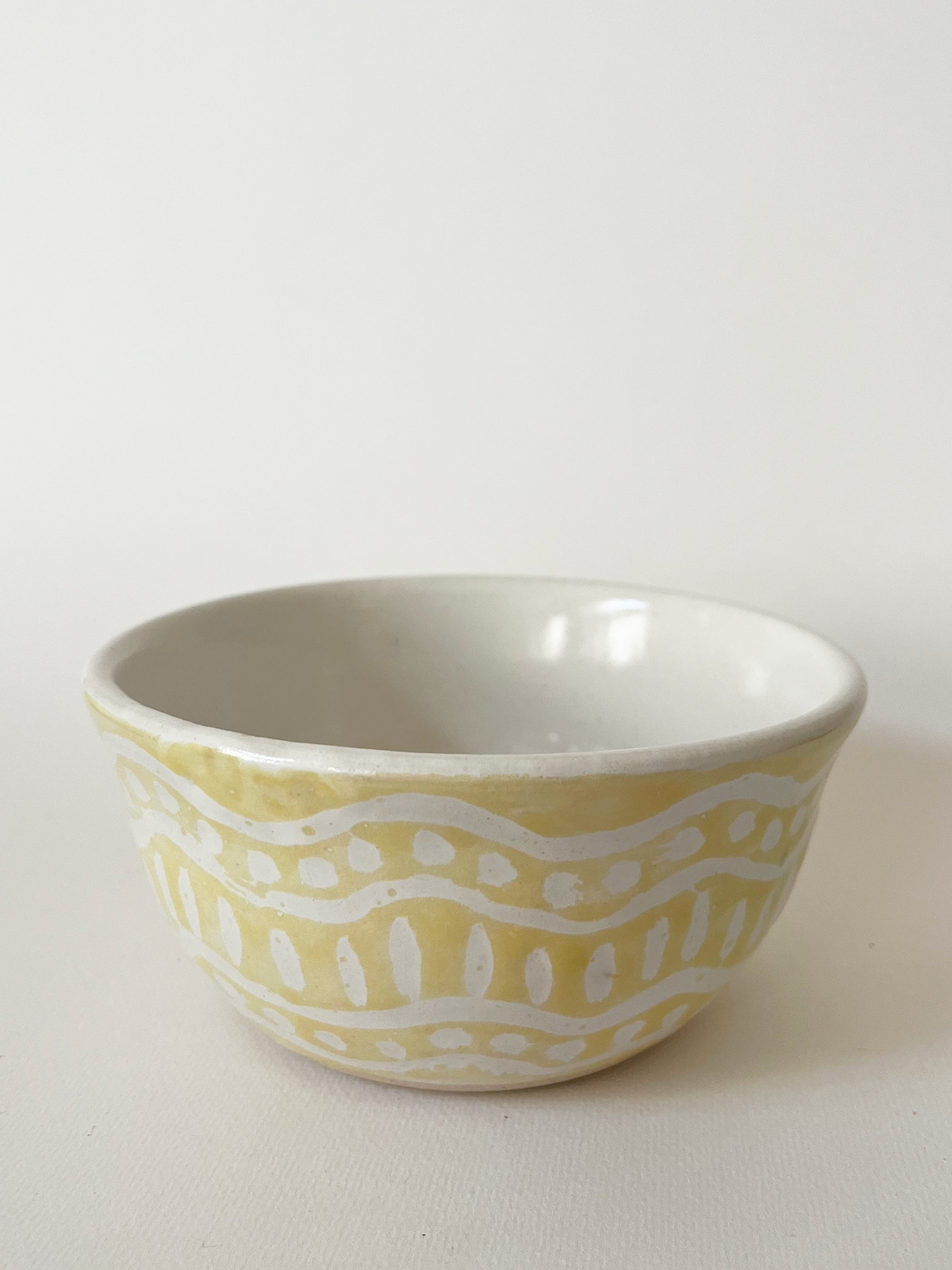 These lovely bowls are the perfect size for cereal, puddings or snacks! Handbuilt from stoneware clay with a hand-painted batik design in lemon yellow and white glaze. These come in a range of joyful colours.