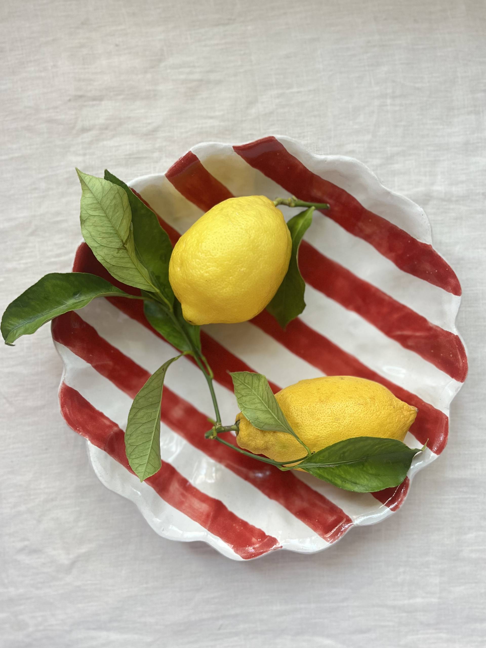 Handmade stoneware bowl with a scallop trim and hand-painted stripe design in shiny red with contrasting matt white glaze. A rustic, stylish addition to your table!